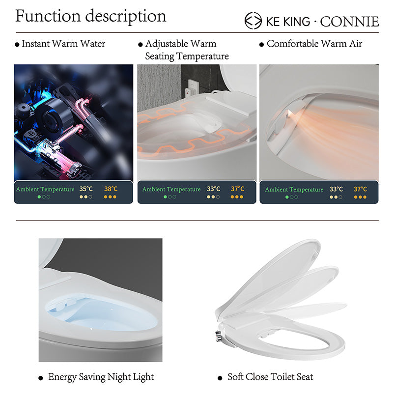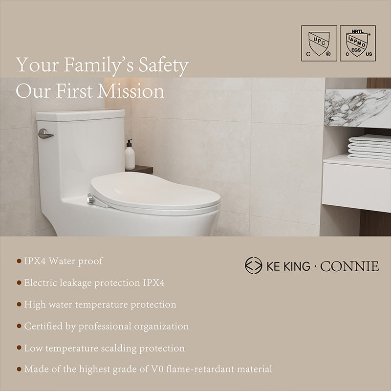 - Safe Electric Bidet: KE KING adheres to the first principle of customer safety and comfort. Connie is made of the highest grade of V0 flame-retardant material and certified by cUPC, EGS, and other professional organizations. It also has functions like low-temperature scalding protection, electric leakage protection IPX4, and high water temperature protection.