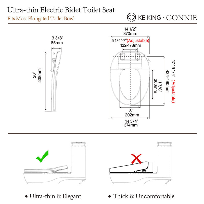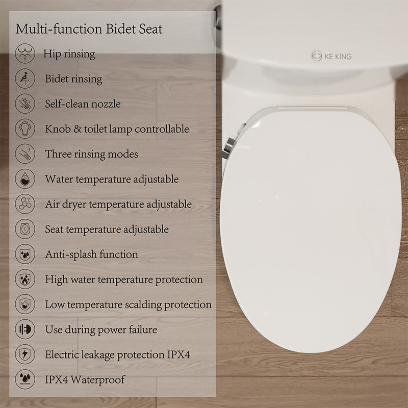 - Multi-function Bidet Toilet Seat: KE KING ultra-thin electric bidet toilet seat features front & rear wash, controllable night light, self-clean nozzle, three rinsing modes, and adjustable heating functions. All functions can be blind operated through buttons and dial on both sides.