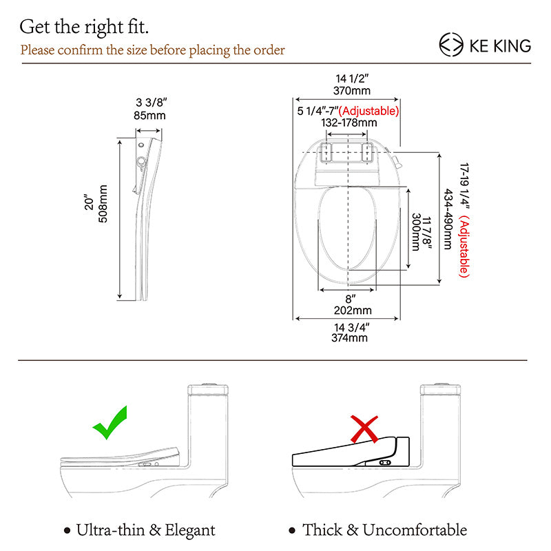 - Ultra Thin Bidet: Transform your bathroom with KE KING's ultra-thin bidet seat, expertly crafted to fit the most elongated toilet seats. Its sleek, modern design is sure to add a touch of elegance to your decor, while its ultra-thin profile provides a comfortable and luxurious experience.